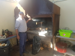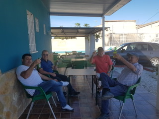 Tre män, en från Colombia och två spanjorer förbereder meny de dia på öppen eld. Ölen serveras och pratstunden börjar på olika språk.